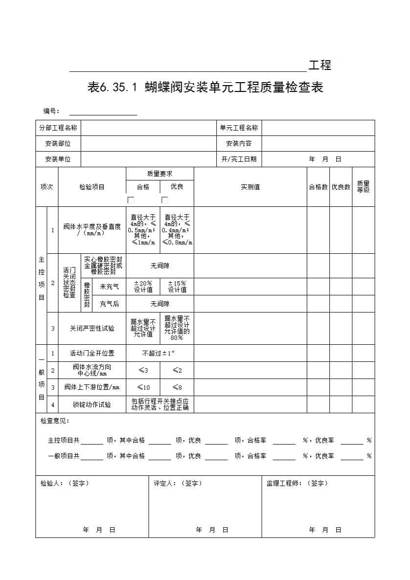 表格名称:表6.35.1 蝴蝶阀安装单元工程质量检查表