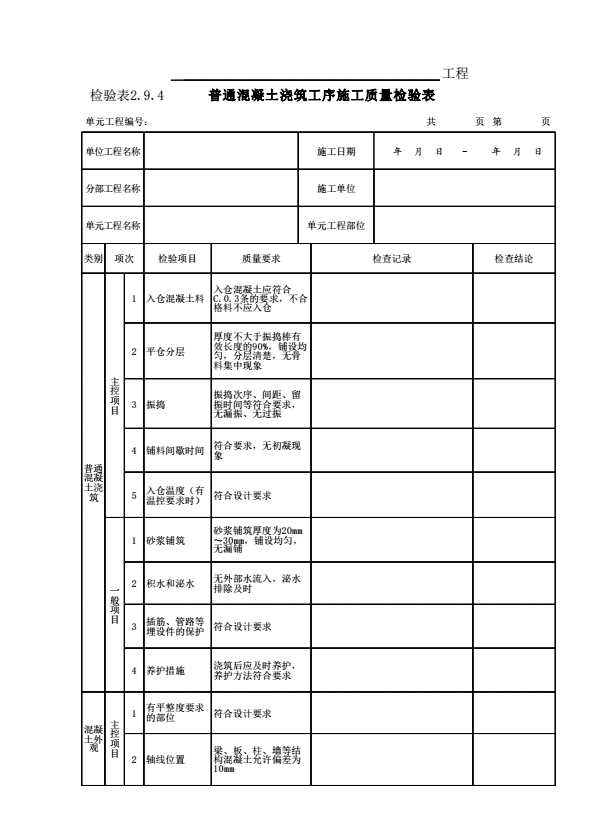 表格名称:表2.9.4 混凝土浇筑工序施工质量检验表