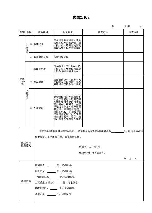 表2.9.4 混凝土浇筑工序施工质量检验表