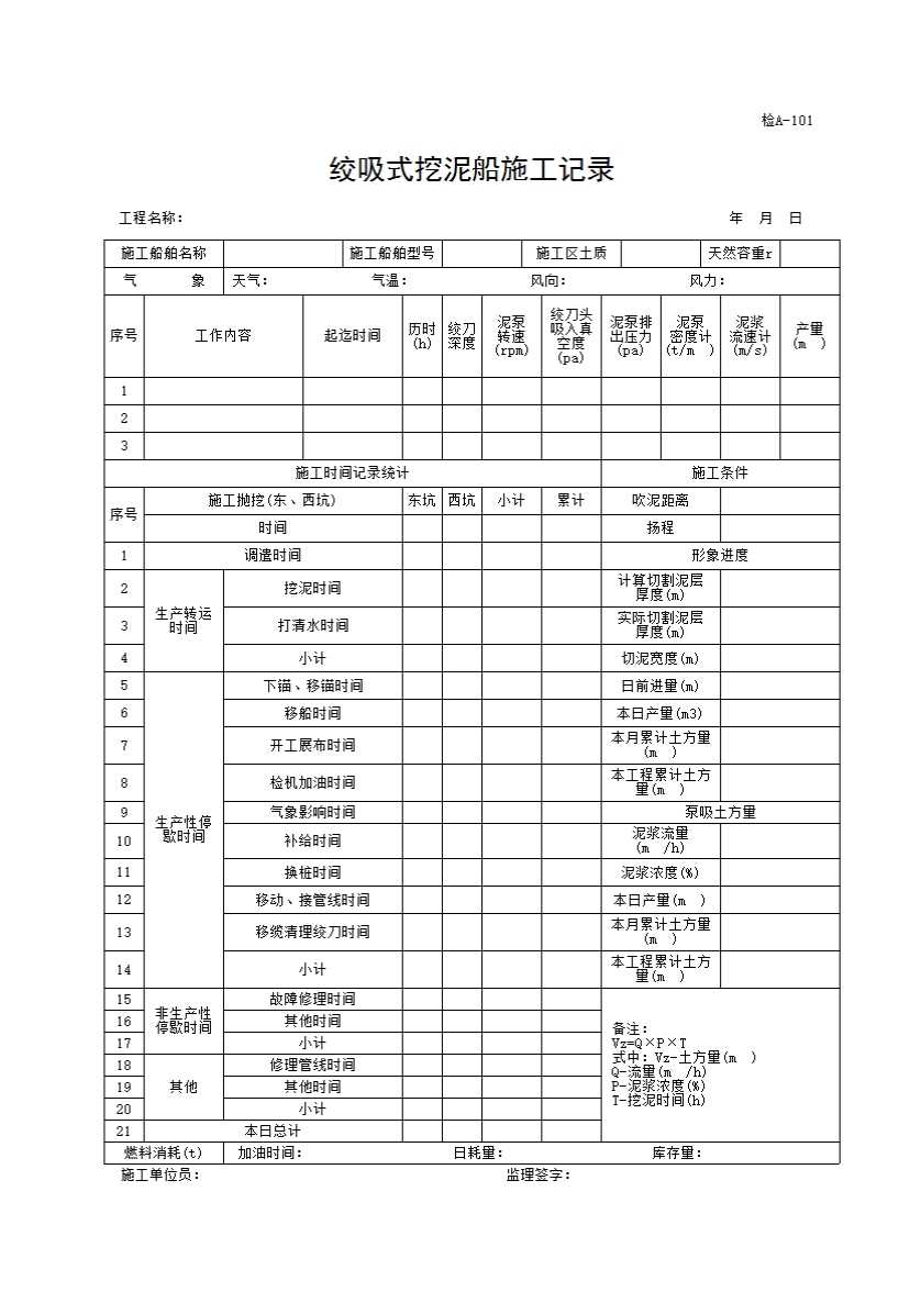 表格名称:101、(评A-101)绞吸式挖泥船施工记录