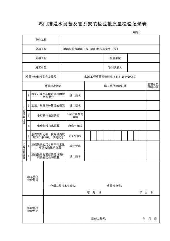 表格名称:坞门排灌水设备及管系安装检验批质量检验记录表