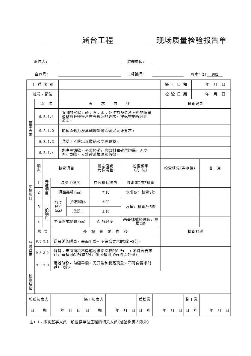 表格名称:浙水:ZJ902 涵台工程现场质量检验报告单
