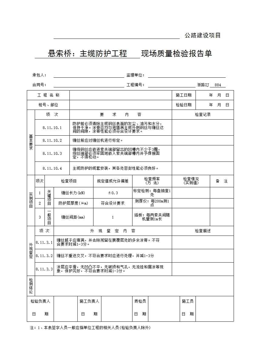 表格名称:浙路ZJ884 悬索桥:主缆防护工程现场质量检验报告单