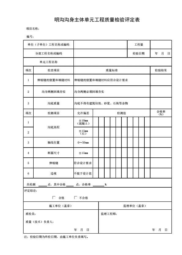 表格名称:明沟沟身主体单元工程质量检验评定表