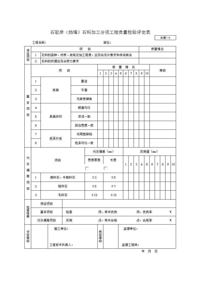 表格名称:石驳岸(挡墙)石料加工分项工程质量检验评定表