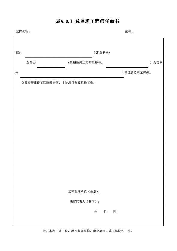 表格名称:表A.0.1 总监理工程师任命书