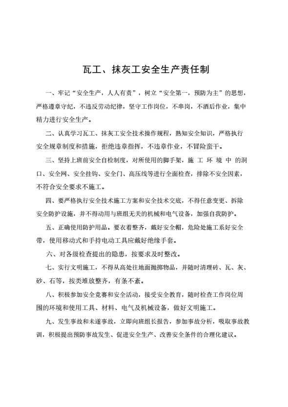 瓦工、抹灰工安全生产责任制
