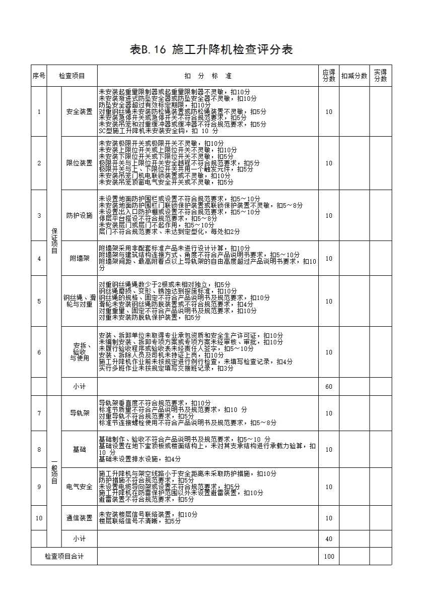 表B.16 施工升降机检查评分表