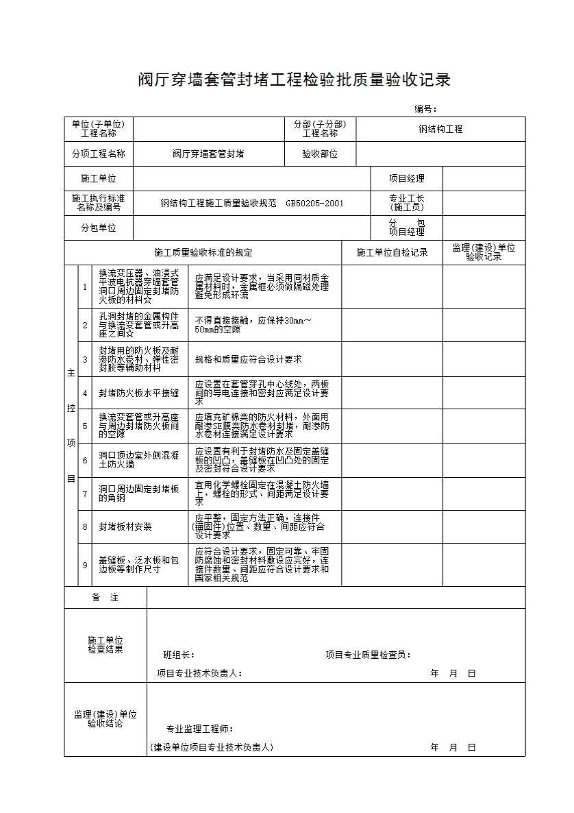 表格名称:阀厅穿墙套管封堵工程检验批质量验收记录