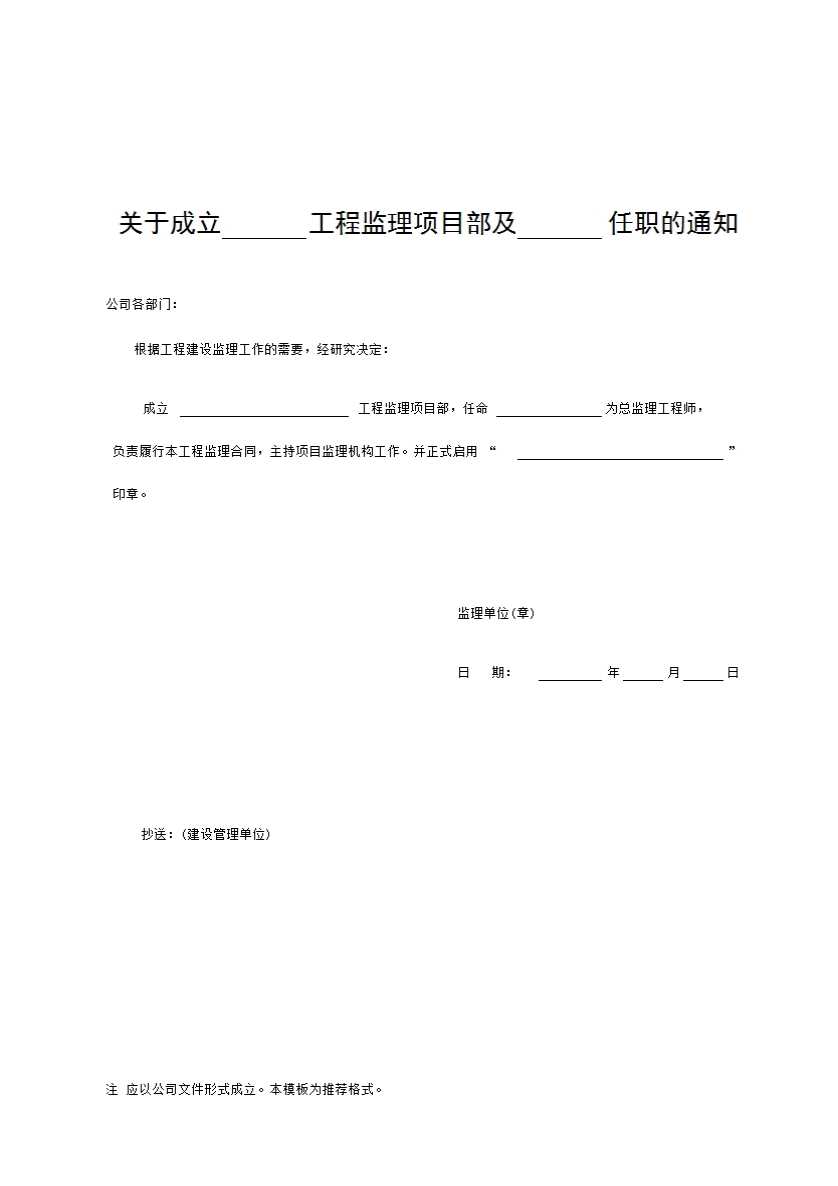 表格名称:JSZ1 监理项目部成立及总监工程师任命