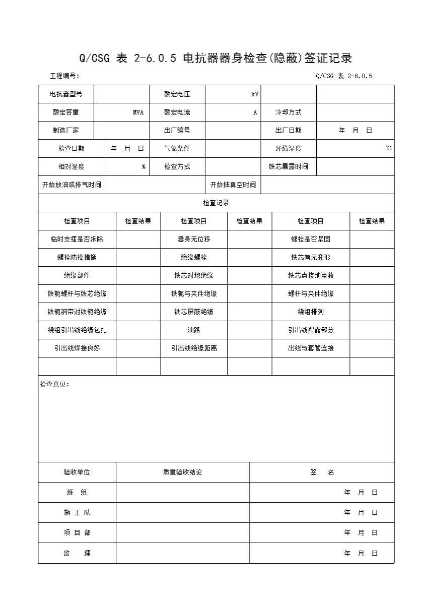 QCSG 表 2-6.0.5 电抗器器身检查(隐蔽)签证记录