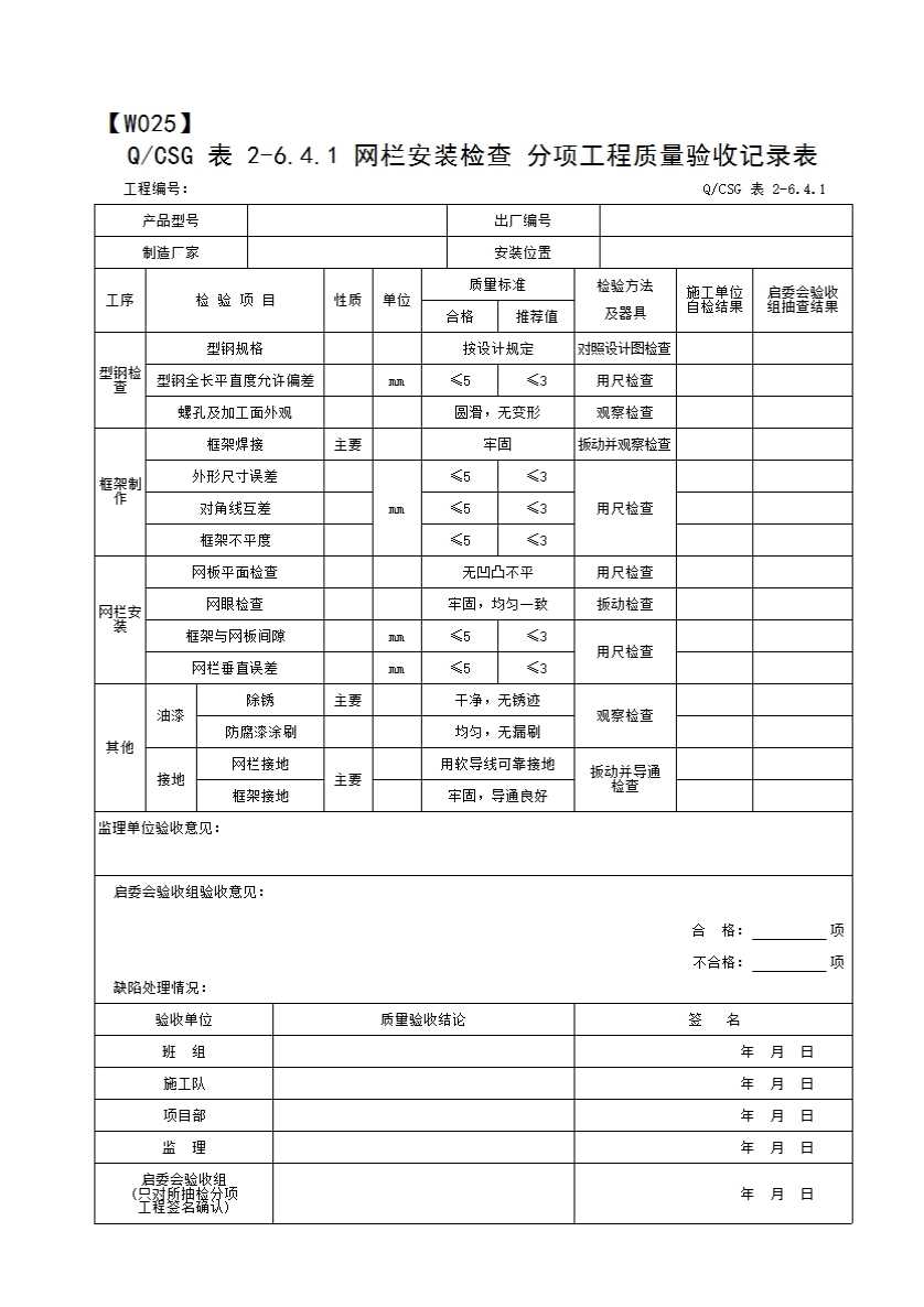 QCSG 表 2-6.4.1 网栏安装检查 分项工程质量验收记录表