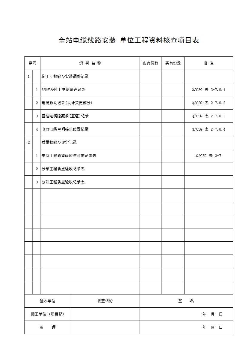 表格名称:全站电缆路线安装 单位工程资料核查项目表
