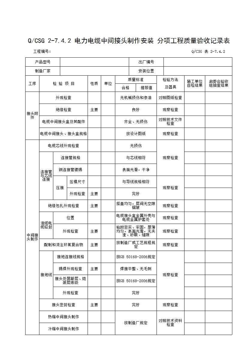 QCSG 表 2-7.4.2 电力电缆中间接头制作安装 分项工程质量验收记录表