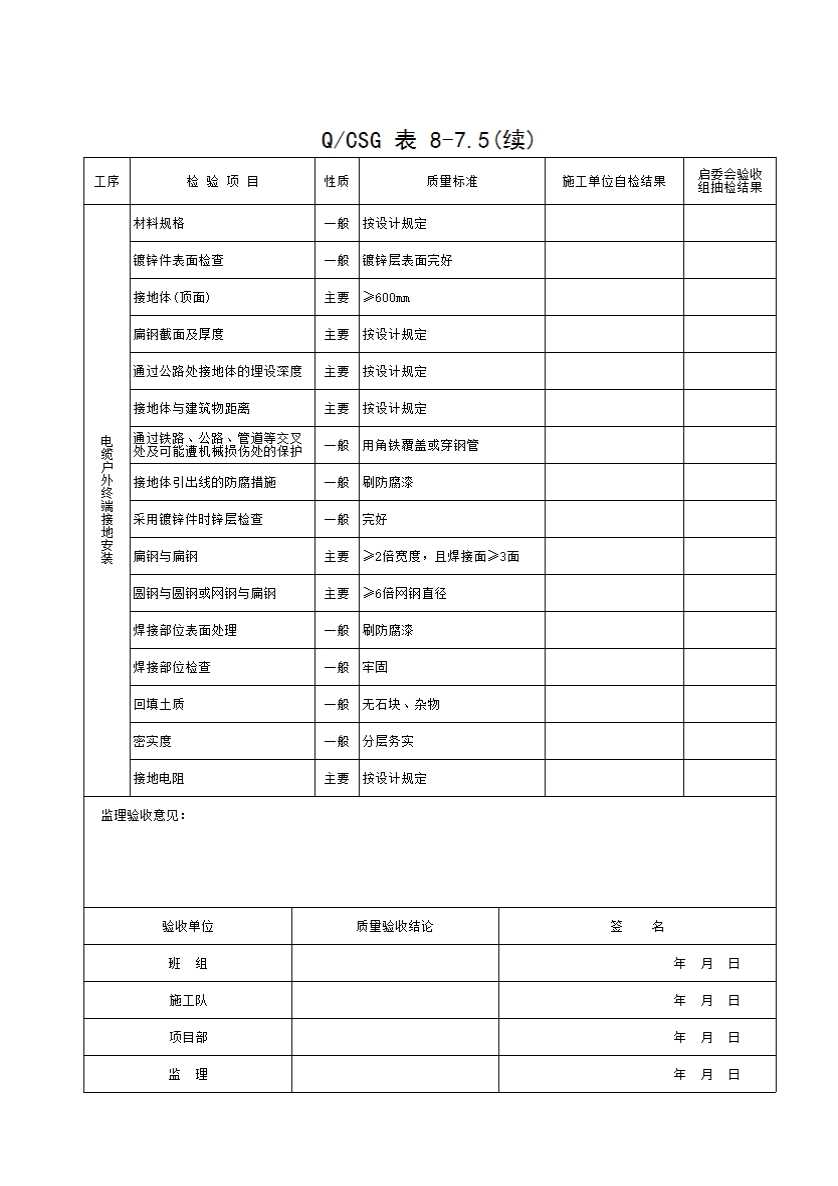 表格名称:QCSG表8-7.5 电缆终端头(中间头)制作安装和电缆终端头(户外)接地及保护管安装 分项工程质量验收记录表
