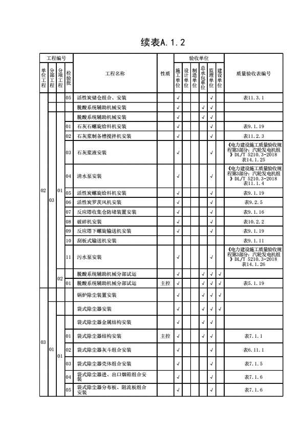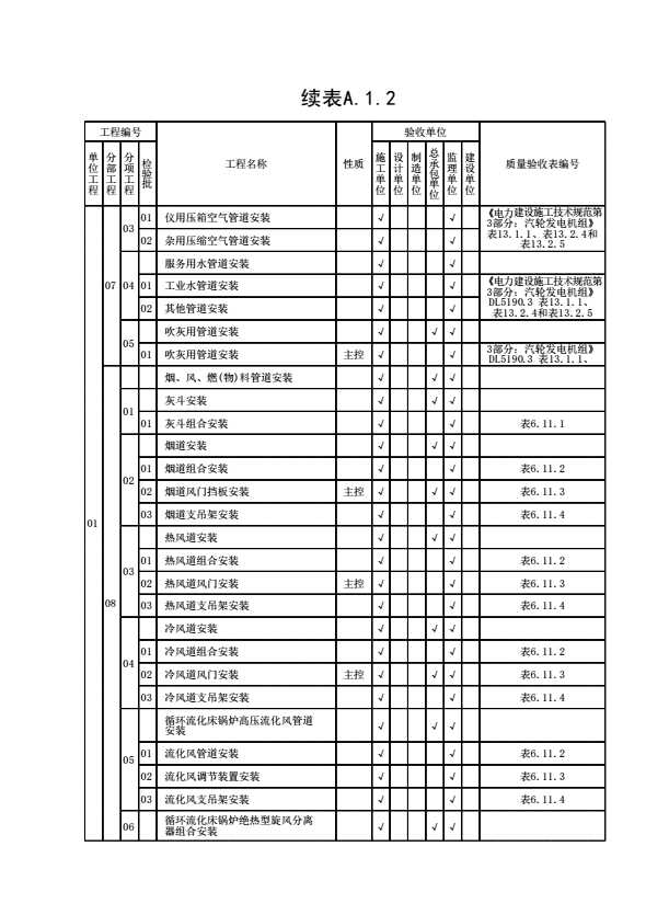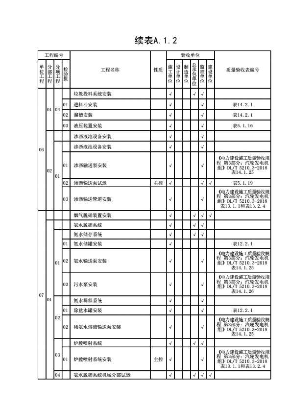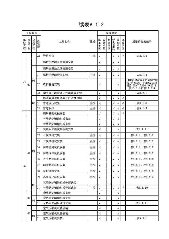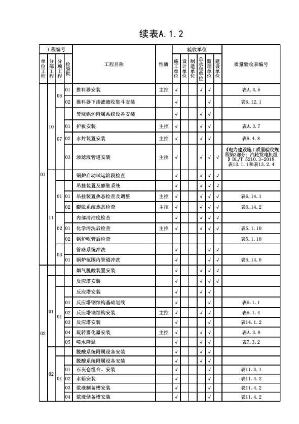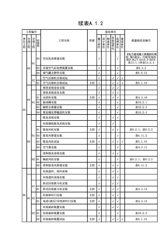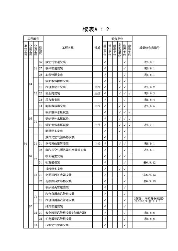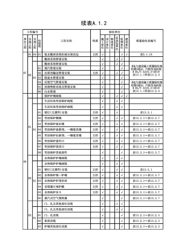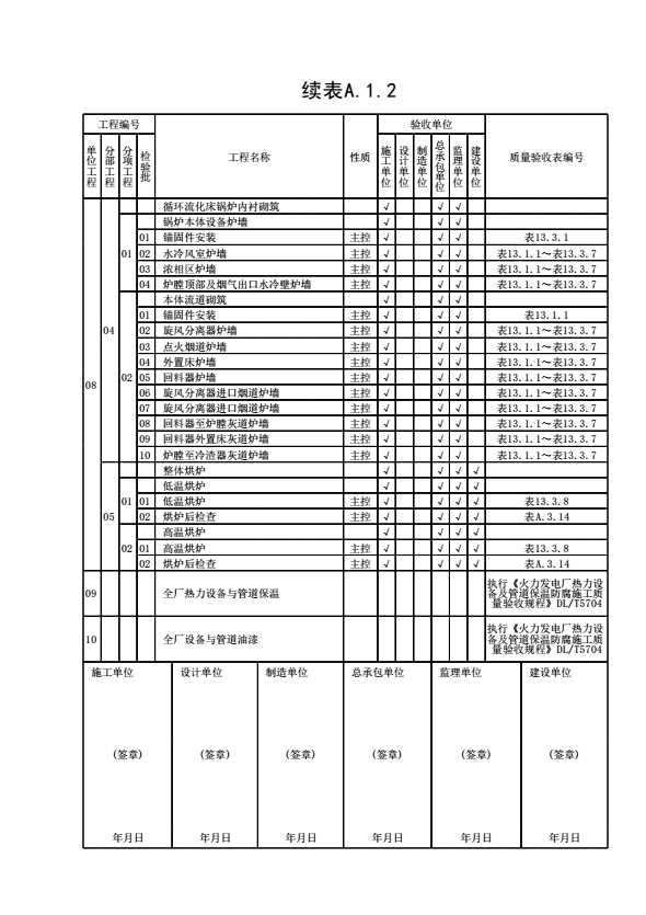 表格名称:表A.1.2 生活垃圾焚烧锅炉施工质量验收范围划分