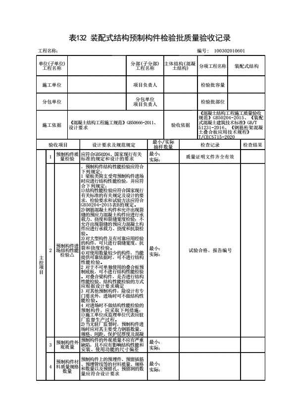 表格名称:100302010601 装配式结构预制构件检验批质量验收记录