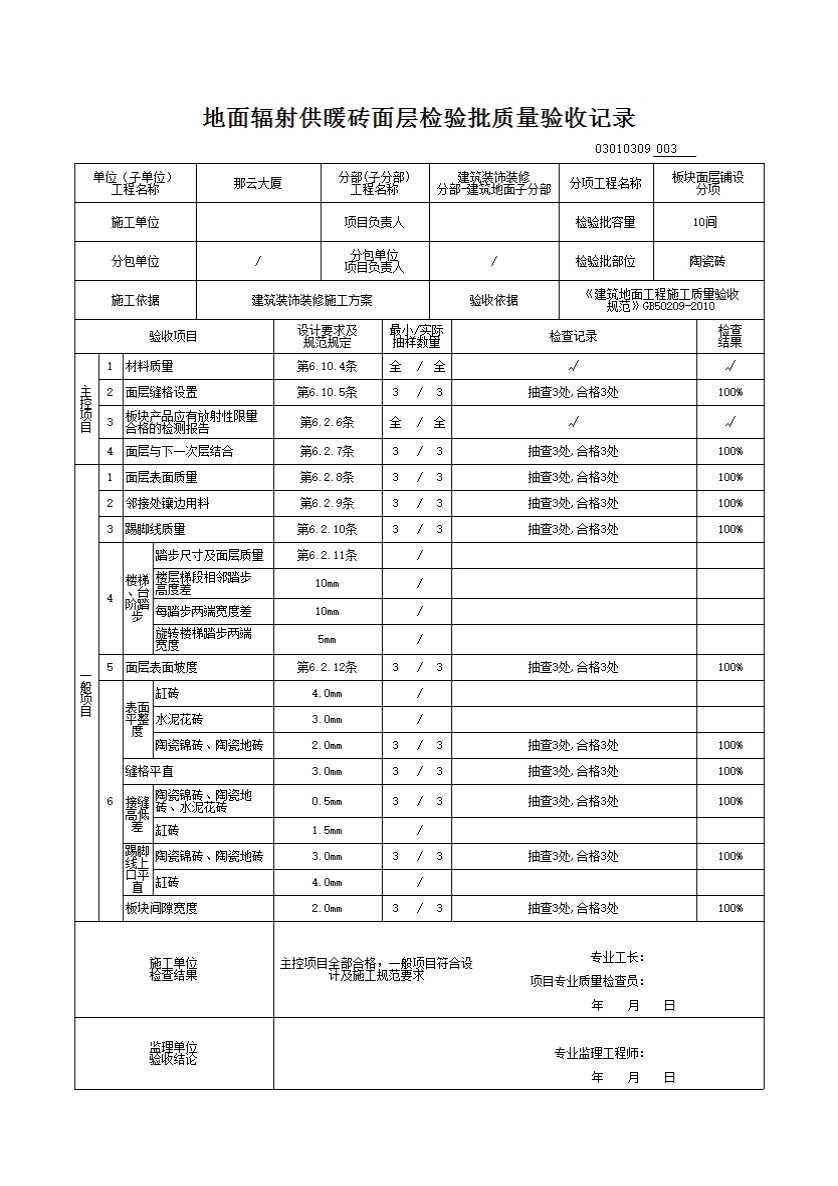 03010309_地面辐射供暖砖面层检验批质量验收记录
