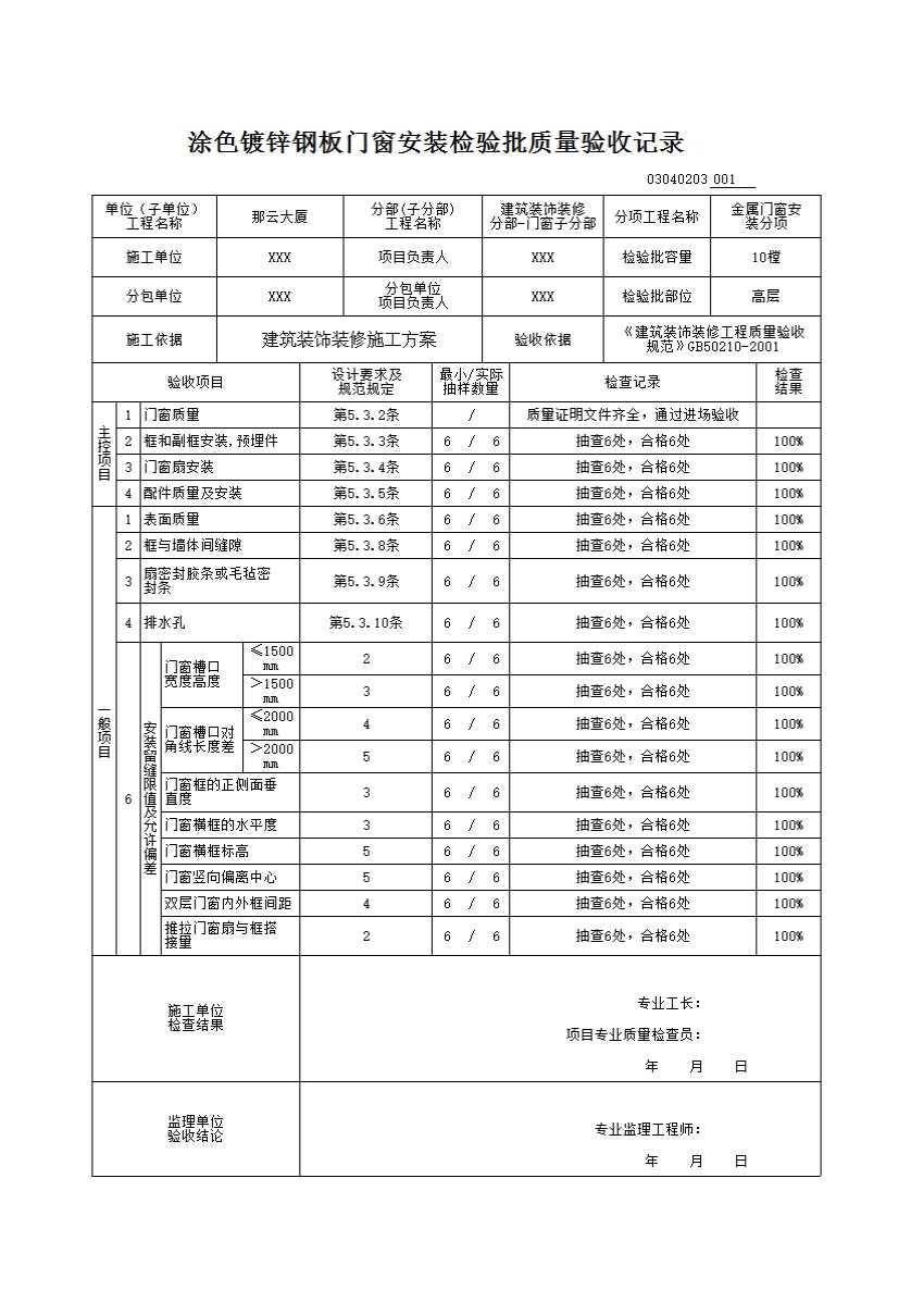 03040203_涂色镀锌钢板门窗安装检验批质量验收记录