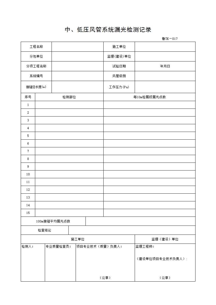 表格名称:鲁TK-017 中、低压钢管系统漏光检测记录