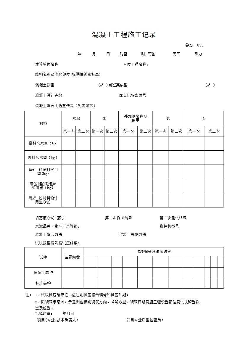 表格名称:鲁ZJ—033 混凝土工程施工记录
