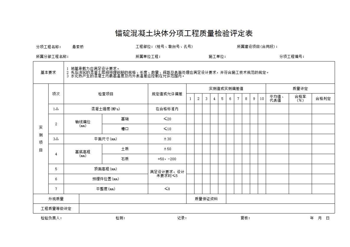 表格名称:锚碇混凝土块体分项工程质量检验评定表