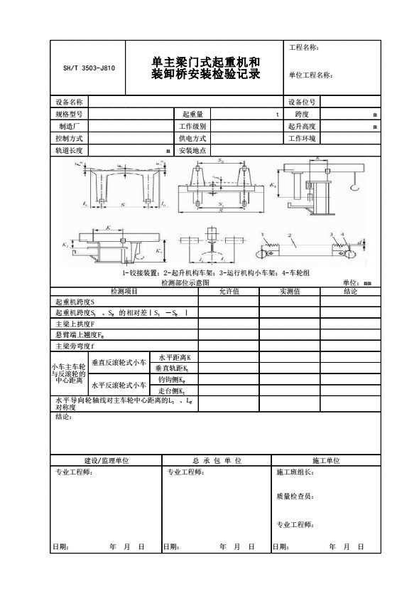表格名称:SH/T 3503-J810 单主梁门式起重机和装卸桥安装检验记录