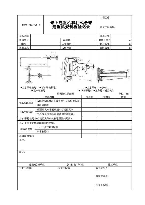 表格名称:SH/T 3503-J811 臂上起重机和柱式悬臂起重机安装检验记录