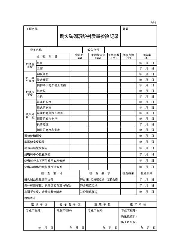 表格名称:B64 耐火砖砌筑炉衬质量检验记录