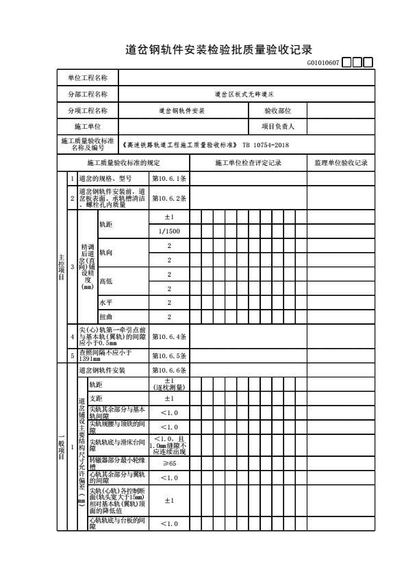 表格名称:G01010607 道岔钢轨件安装检验批质量验收记录