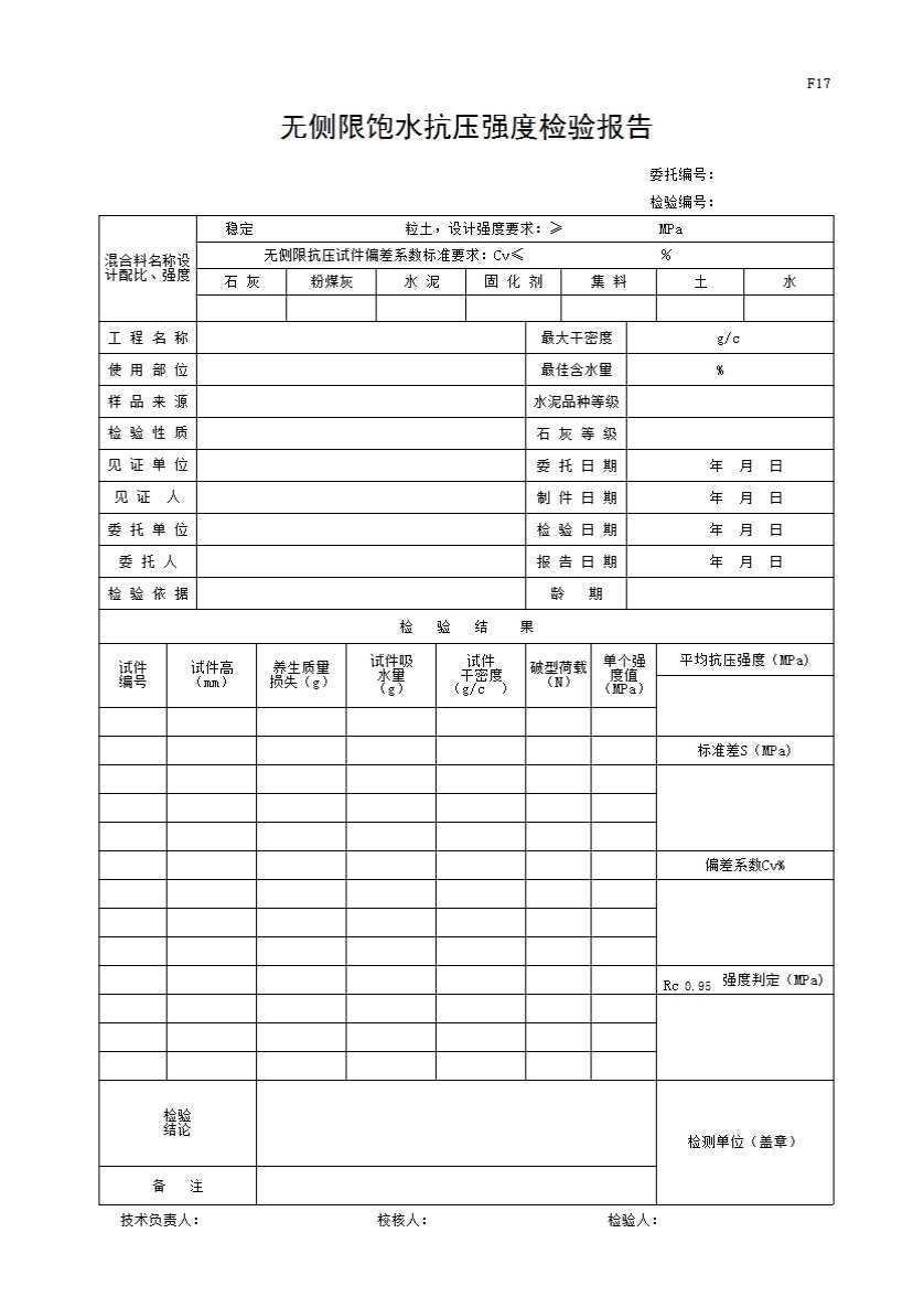表格名称:F17 无侧限饱水抗压强度检验报告