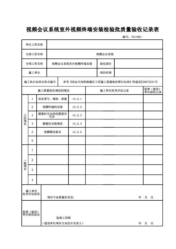 表格名称:TX1402 视频会议系统室外视频终端安装检验批质量验收记录表