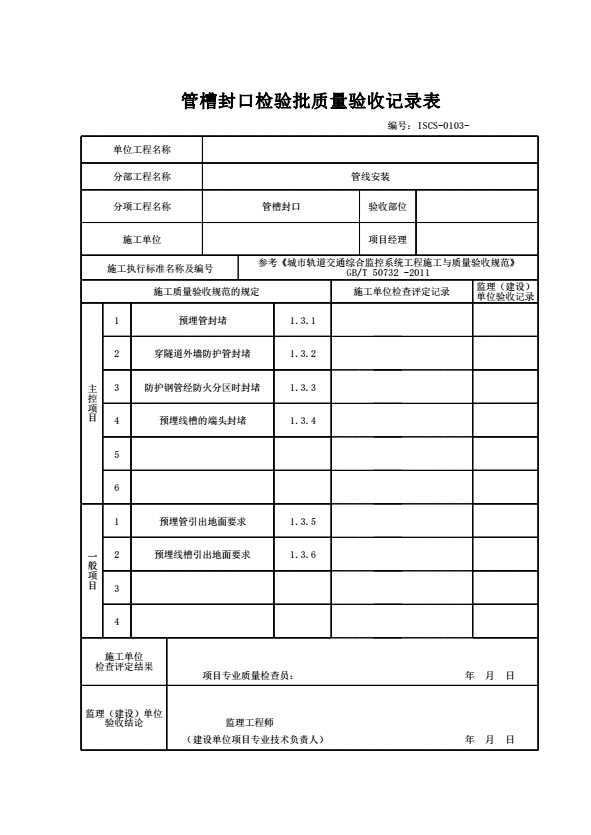 表格名称:ISCS-0103 管槽封口检验批质量验收记录表