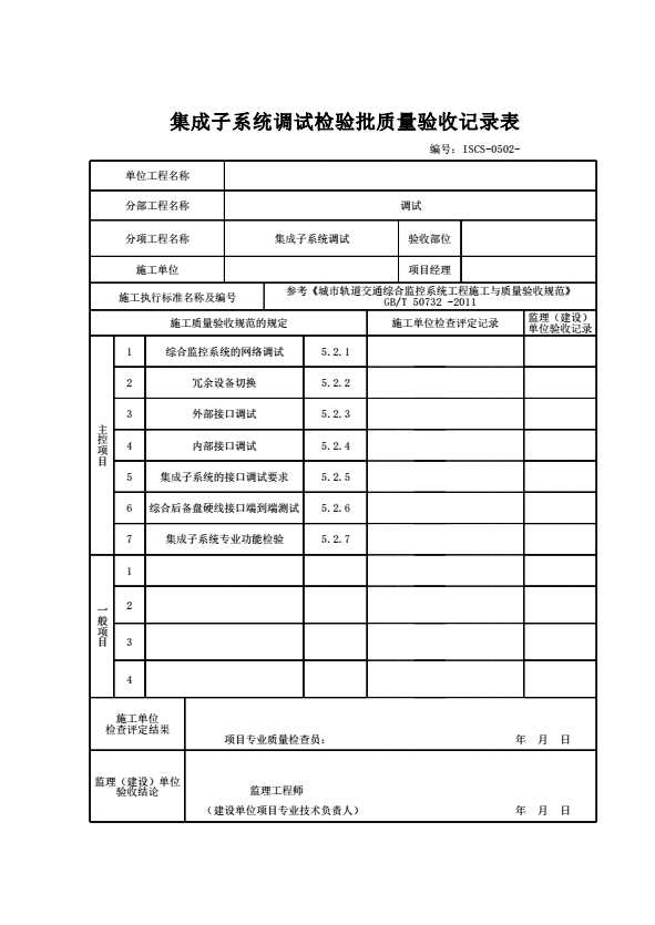 ISCS-0502 集成子系统调试检验批质量验收记录表