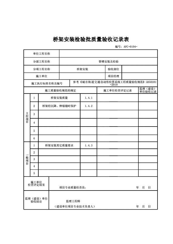 表格名称:AFC-0104 桥架安装检验批质量验收记录表