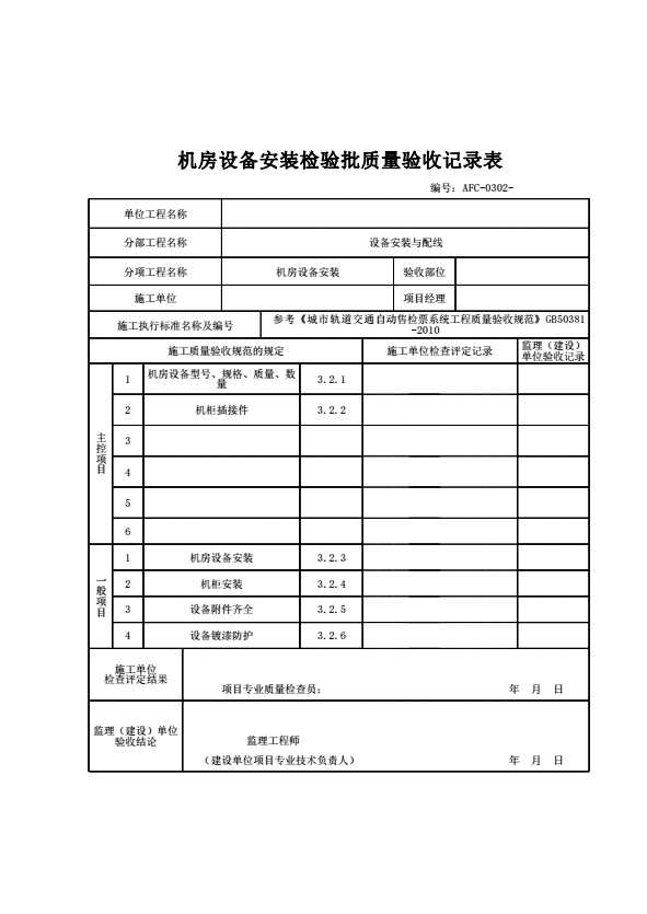 表格名称:AFC-0302 机房设备安装检验批质量验收记录表