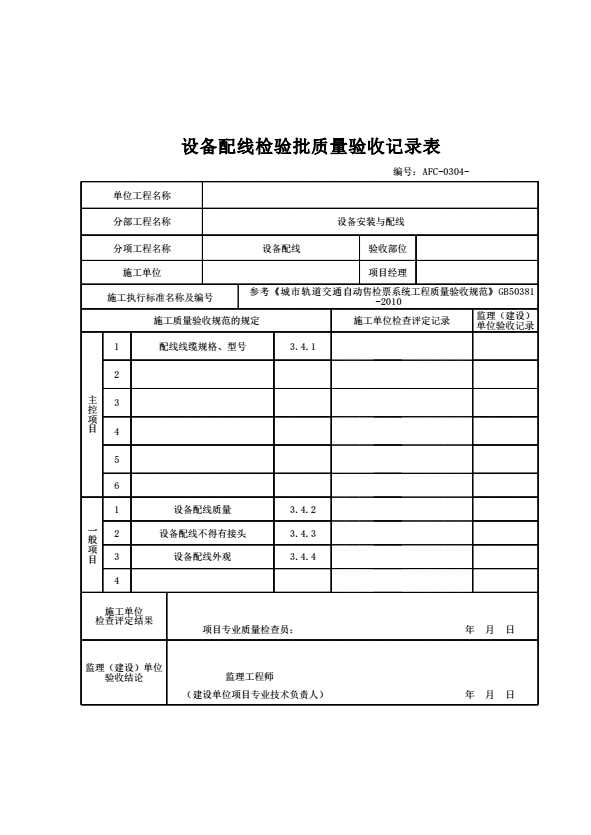表格名称:AFC-0304 设备配线检验批质量验收记录表