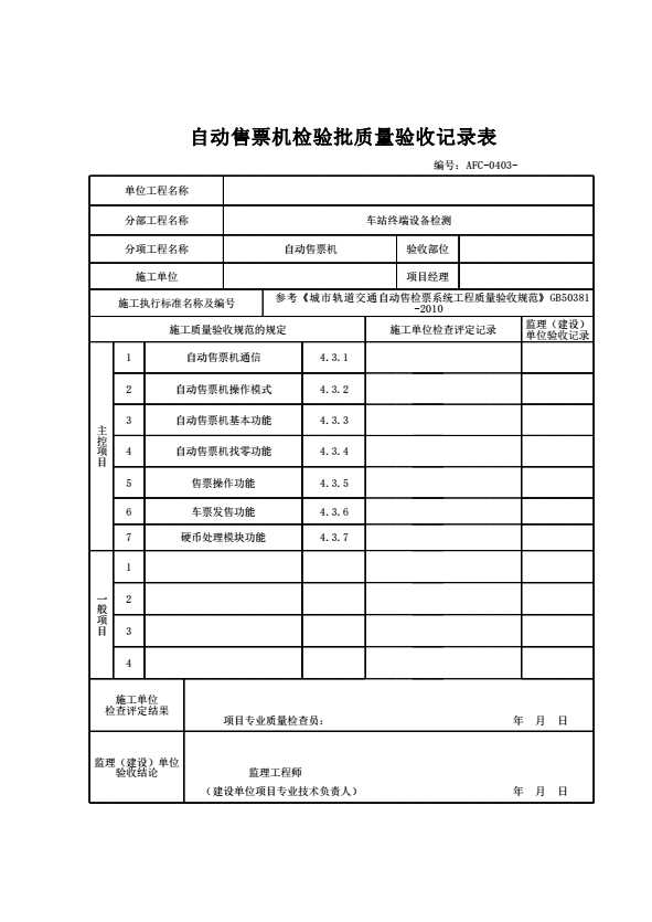 AFC-0403 自动售票机检验批质量验收记录表