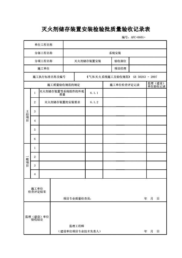 表格名称:AFC-0601 灭火剂储存装置安装检验批质量验收记录表
