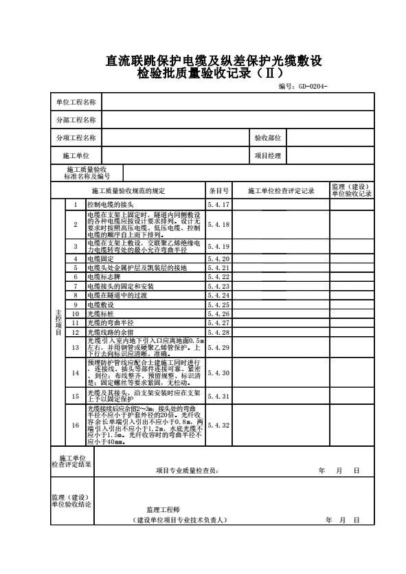 表格名称:表GD-0204 直流联跳保护电缆及纵差保护光缆敷设检验批质量验收记录(Ⅱ)