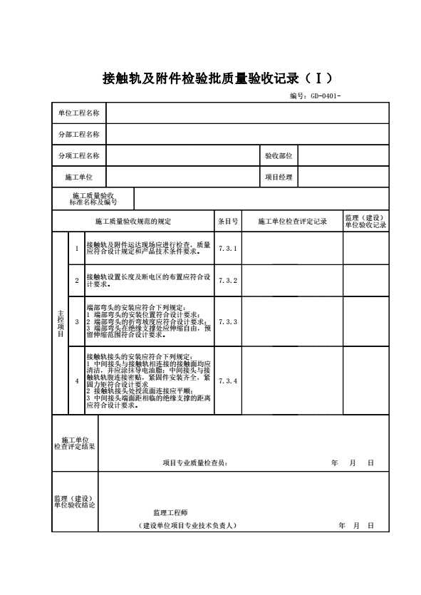 表GD-0402 接触轨及附件检验批质量验收记录(Ⅰ)