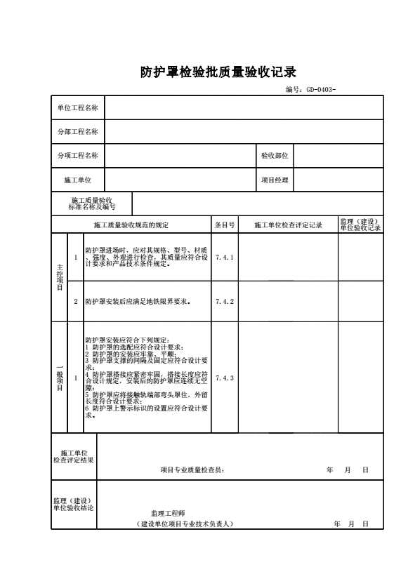表格名称:表GD-0403 防护罩检验批质量验收记录