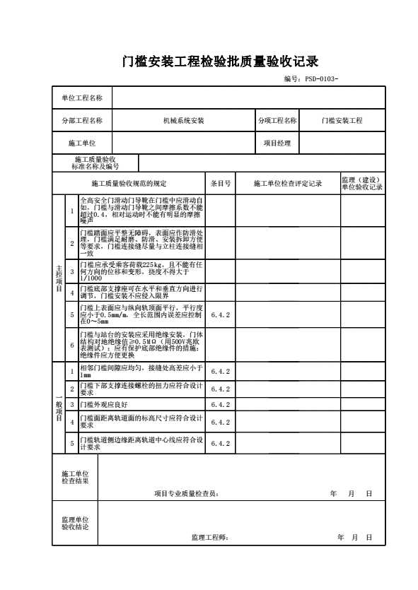 表PSD-0103 门槛安装工程检验批质量验收记录