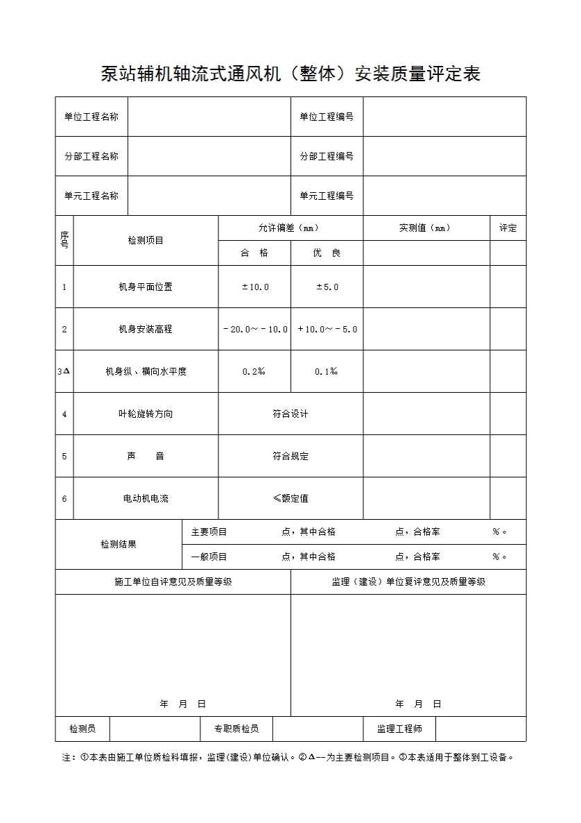 表格名称:泵站辅机轴流式通风机(整体)安装质量评定表