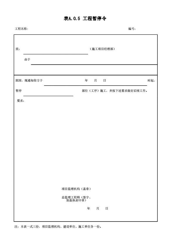表格名称:表A.0.5 工程暂停令