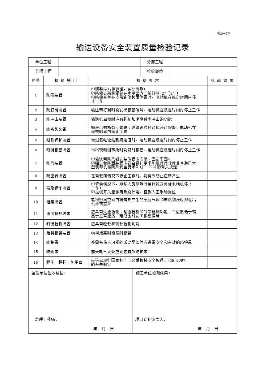 表格名称:79、(评A-79)输送设备安全装置质量检验记录