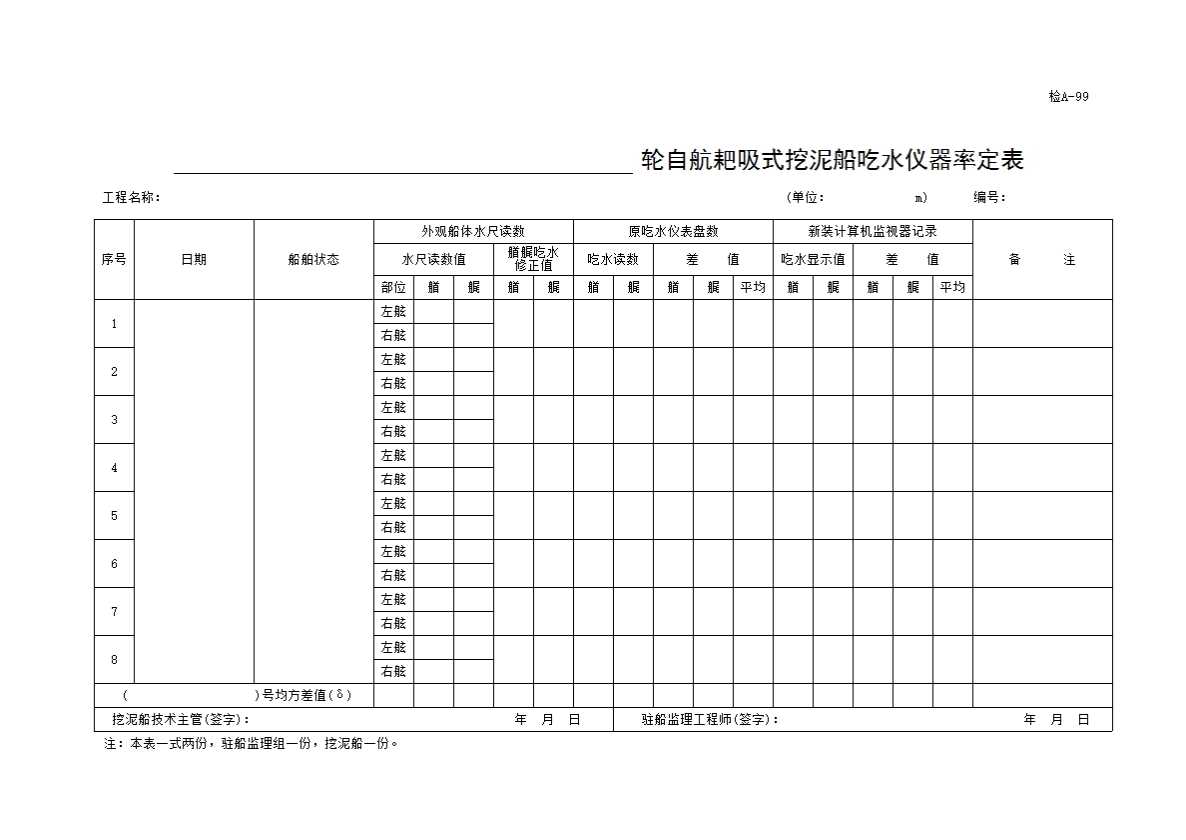 表格名称:99、(评A-99)轮自航耙吸式挖泥船吃水仪器率定表