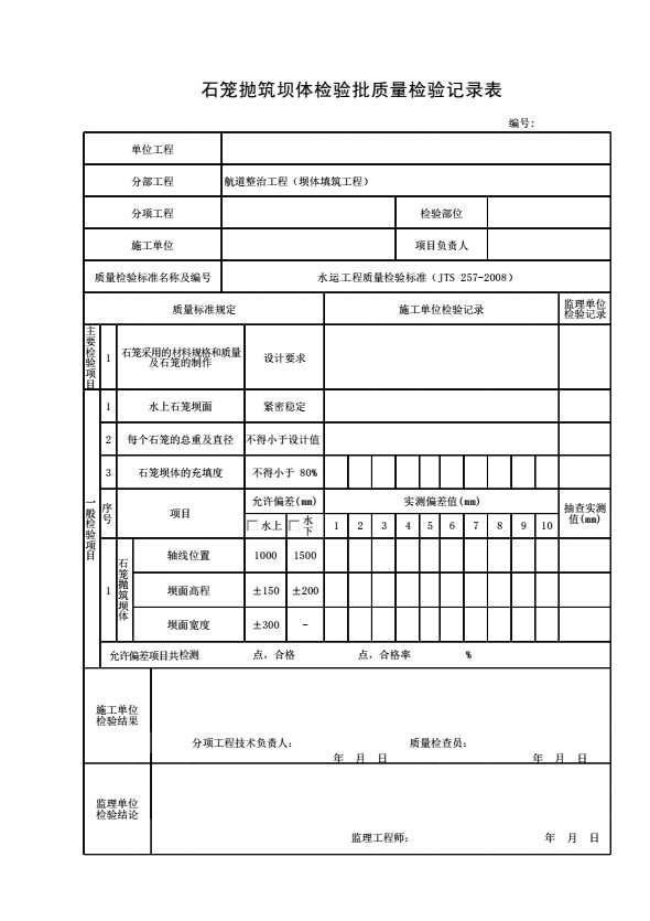 表格名称:石笼抛筑坝体检验批质量检验记录表