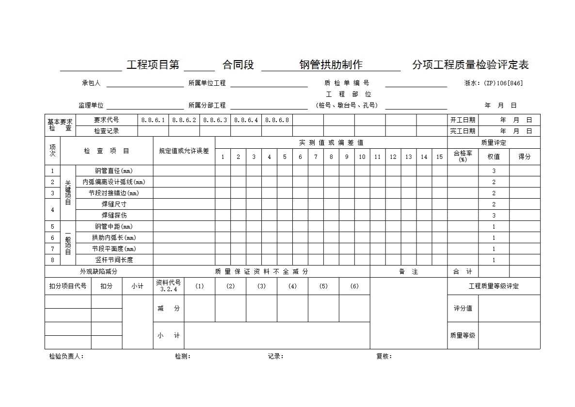 表格名称:046 钢管拱肋制作分项工程质量检验评定表