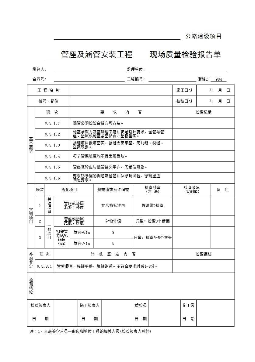 表格名称:浙路ZJ904 管座及涵管安装工程现场质量检验报告单